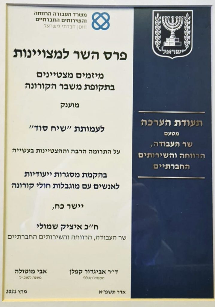 מהנעשה Seeach Sod Wins Welfare Minister Award 2020 for Outstanding Initiative During the Coronavirus Pandemic